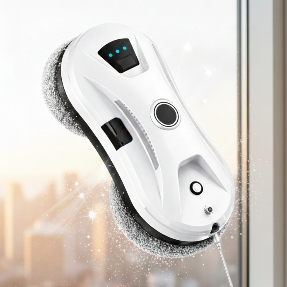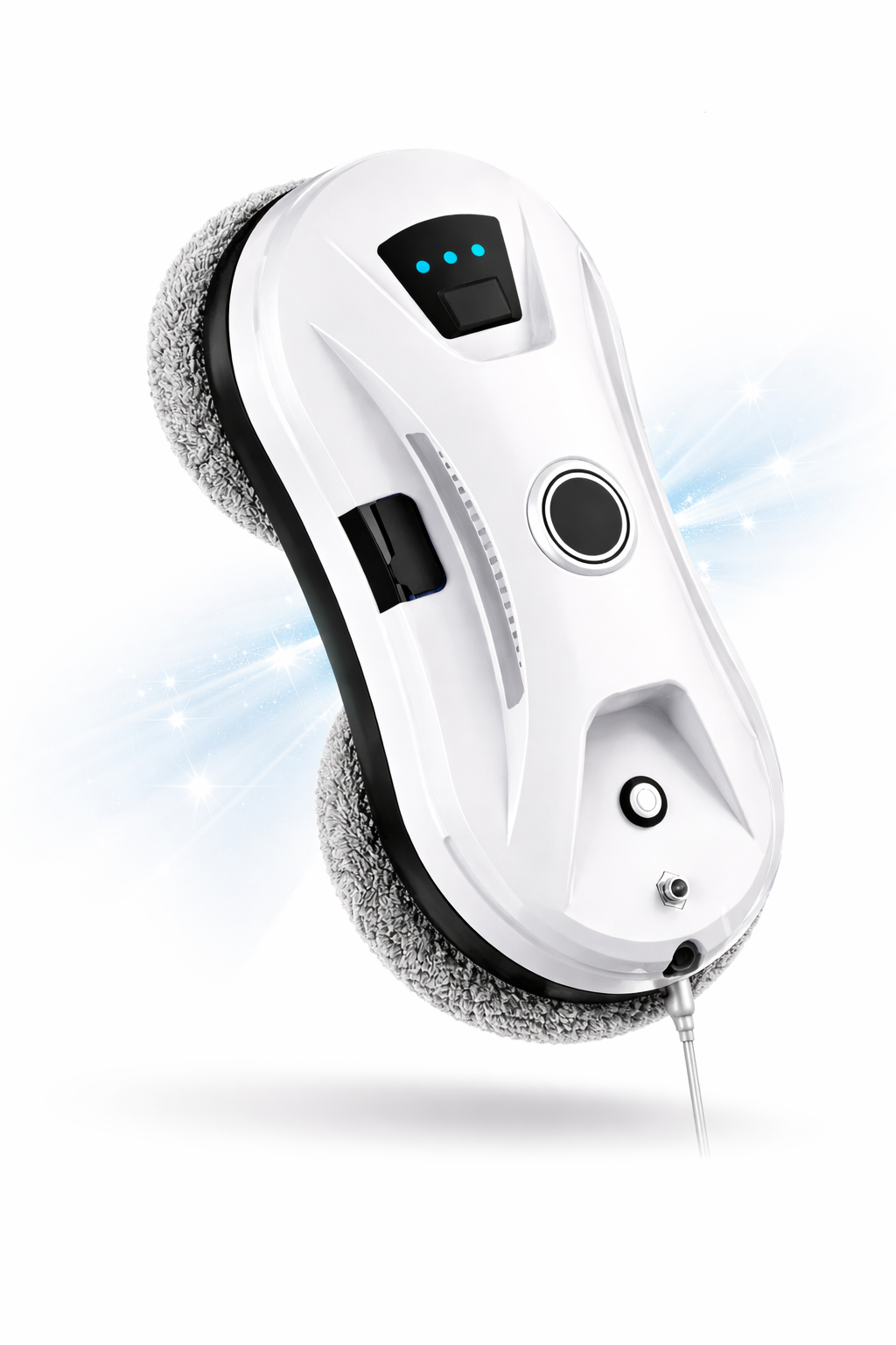 Appareil électrique de nettoyage des surfaces vitrées destiné à un usage domestique sur fenêtres, baies vitrées, miroirs et autres surfaces lisses en verre. Système de nettoyage automatisé permettant le déplacement du robot sur la surface vitrée afin d’effectuer l’entretien des zones accessibles.